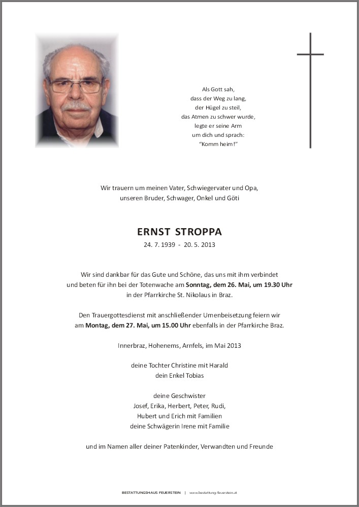 Bestattung wurde durchgeführt von: Christoph Feuerstein Bestattung Christoph Feuerstein Sturnengasse 26 6700 - Bludenz Tel.: 05552 62079-0 zum Bestatter