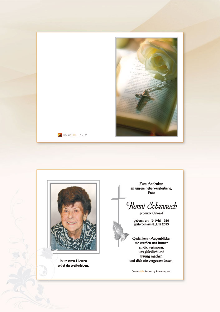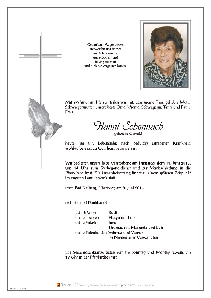Ich glaube dieser Spruch trifft auf Hanni sehr gut zu. Sie war immer fröhlich und dankbar. War immer gut gelaunt und für alle da. Danke Hanni dass ich dich auf deinem letzten Lebensabschnitt begleiten durfte, du bist mir eine liebe Freundin geworden. Ich werde dich und deine herzliche Art sehr vermissen. Dir Helga und Ines wünsche ich viel Kraft und Gottes Beistand in der kommenden Zeit. Bin im Gebet mit Euch verbunden