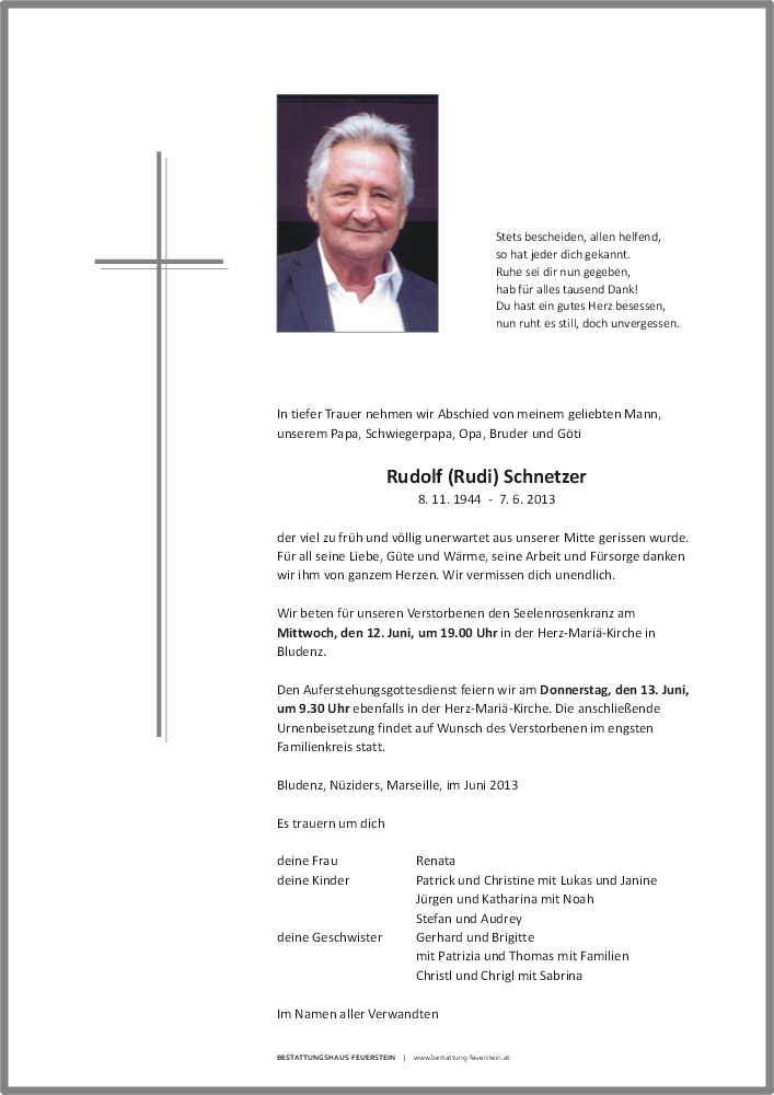 Bestattung wurde durchgeführt von: Christoph Feuerstein Bestattung Christoph Feuerstein Sturnengasse 26 6700 - Bludenz Tel.: 05552 62079-0 zum Bestatter