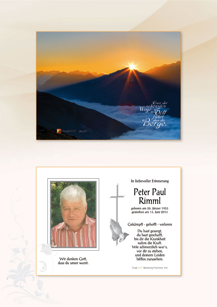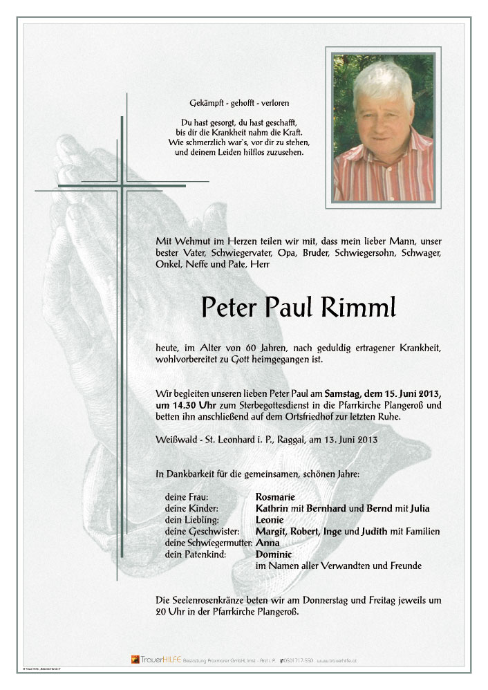 Sie kennen mich nicht--ich war mit meinen Eltern als junger Mensch bei Rosa und Rochus Rimml im Urlaub.Wir Kinder hatten immer viel Spass zusammen.Beim stöbern im Internet habe ich mit Trauer die Todesanzeige von Peter-Paul gelesen.Es tut mir leid,dass er so früh gehen musste.Ich wünsche Ihnen viel Kraft und würde mich freuen ,wenn Sie Peter-Pauls Geschwister von mir grüssen würden.Alles Gute --ich wurde immer Biggi genannt.22.06.2013 19:11 - Brigitte Schwenzfeier geb.Ludwig