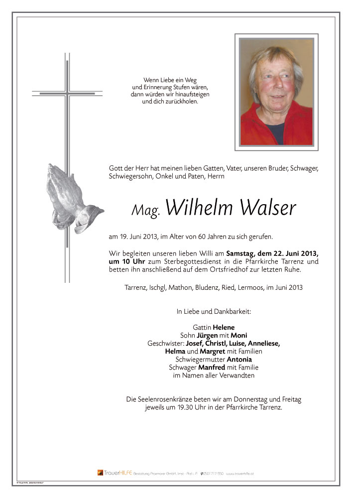 Liebe Familie Walser! Willi war vor ca. 25 Jahren mein Religionslehrer an der HTL Imst. Er hat uns Schülern immer Verständnis entgegengebracht und man durfte mit jedem Problem zu ihm kommen. Er war einer der Wenigen die uns Jugendliche ernst genommen haben. Mein Leben wurde durch ihn positiv beeinflusst und ich bin ihm sehr dankbar dafür. Ich wünsche euch viel Kraft in dieser schweren Zeit.</p>