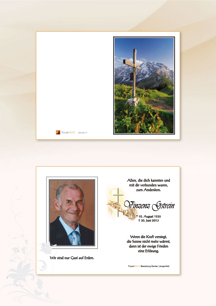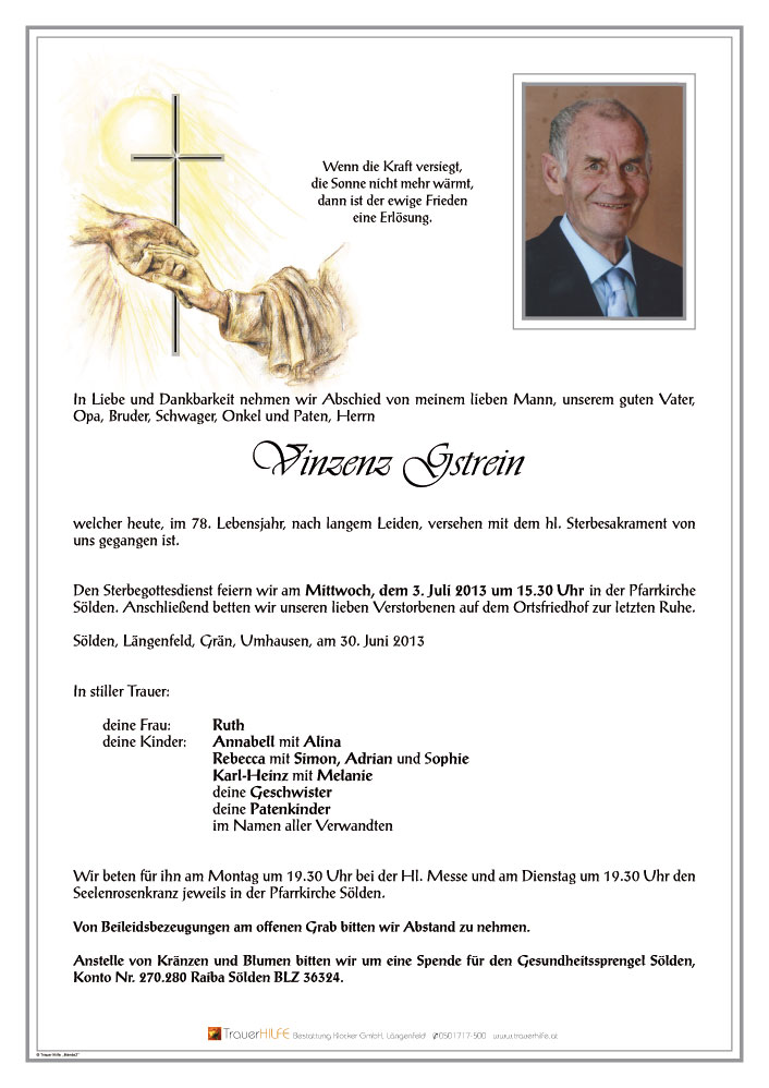 Liebe Familie Gstrein! Mein herzliches Beileid zum Ableben von Vincens und viel kraft In dieser schweren zeit wünscht euch Polak Maria .