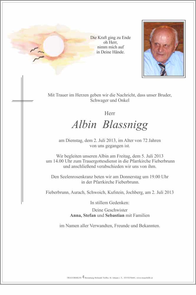Bestattung wurde durchgeführt von: Bestattung St. Johann Huber-Sturm Bestattung St. Johann Huber-Sturm Bestattung St. Johann Huber-Sturm GmbH Salzburgerstraße 27 6380 - St. Johann in Tirol Tel.: 050 1717 190 zum Bestatter