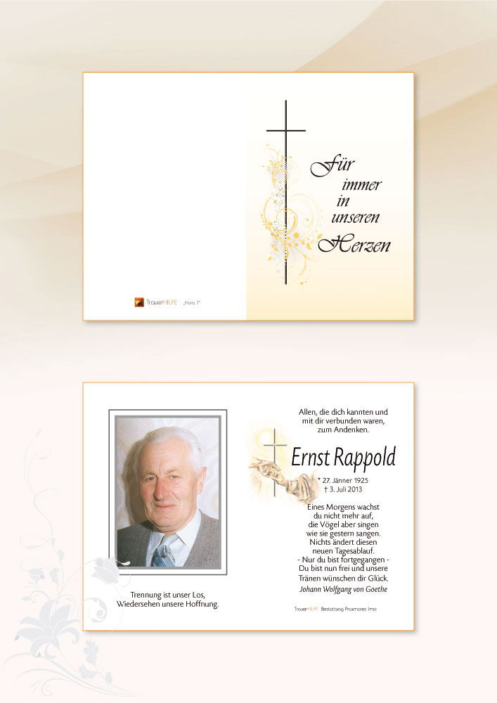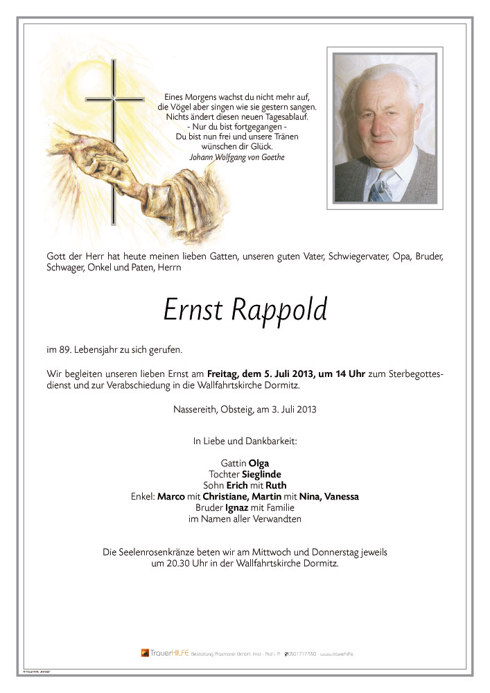 Du warst für uns ein ganz wertvoller und besonderer Mensch für uns. Wir denken oft an dich und werden dich nie vergessen. Danke für die schönen und lustigen Momente mit dir. Habe die Ehre, Ernst! Alles Gute für deine letzte Reise