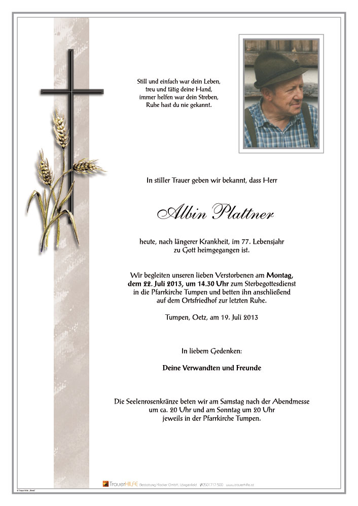 Bestattung wurde durchgeführt von: Daniel Klocker Bestattung Klocker GmbH Oberlängenfeld 41 6444 - Längenfeld Tel.: 05253 5561 zum Bestatter