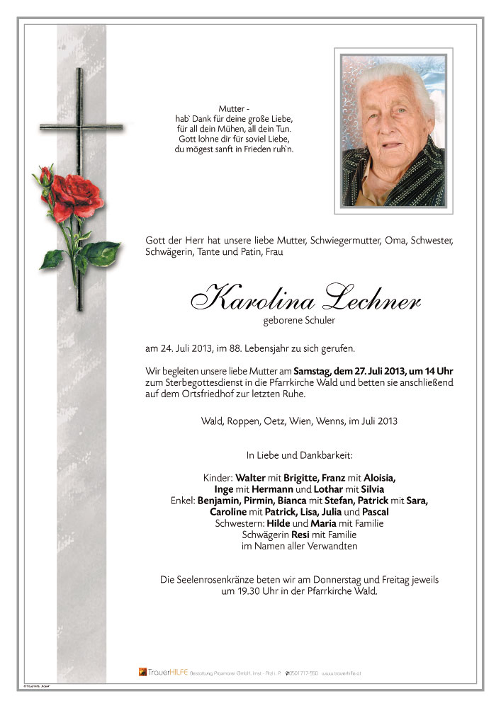 Lieber Walter und Brigitte, liebe Trauerfamilie! Unsere Gedanken begleiten Dich lieber Walter durch die schwere Zeit des Abschieds und der Trauer. Aber ich w&uuml;nsche dir bald eine Zeit, wo Du Dich mit einem L&auml;cheln an die gemeinsam verbrachten Zeiten mit deiner Mutter erinnern kannst. In stiller Anteilnahme Familie Toni Klocker</p>