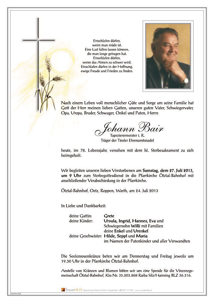 Unser aufrichtiges Beileid und viel Kraft für die Zukunft an alle Trauerfamilien25.07.2013 18:21 - Bair Barbara mit Bernhard & Irene
