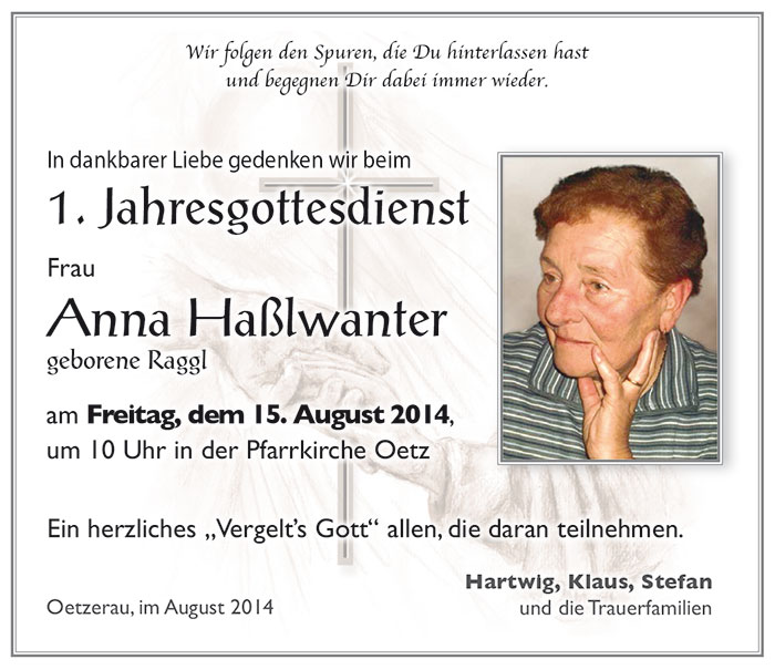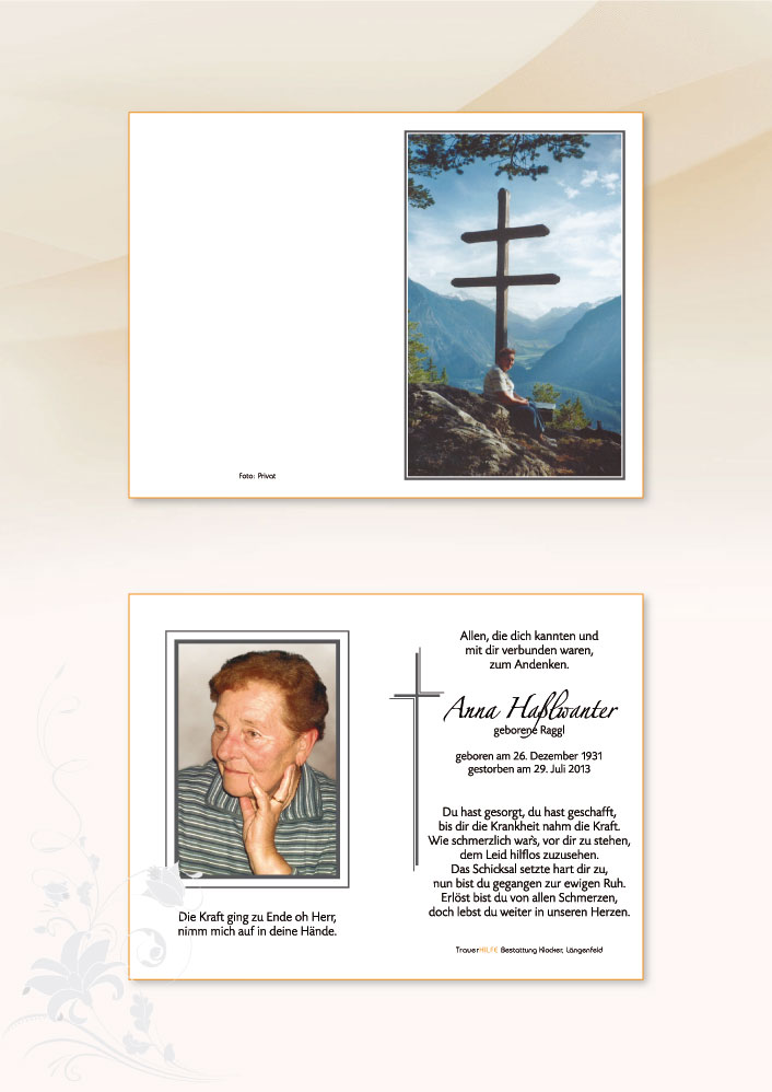 Ich gehe Euch vorausin den ewigen Frieden des Herrnund erwarte Euchzum ewigen Wiedersehen.Gottes Wille ist geschehen.