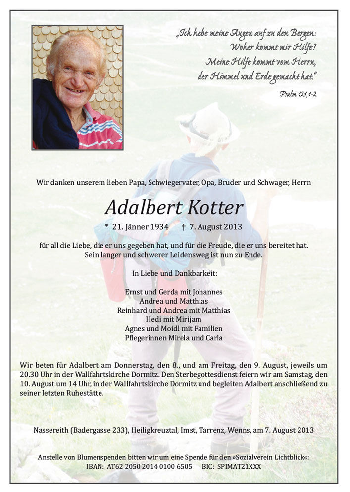 Wenn ihr mich dort findet, dann lebe ich in euch weiter.09.08.2013 13:12 - Fam. Hirschegger Helmuth