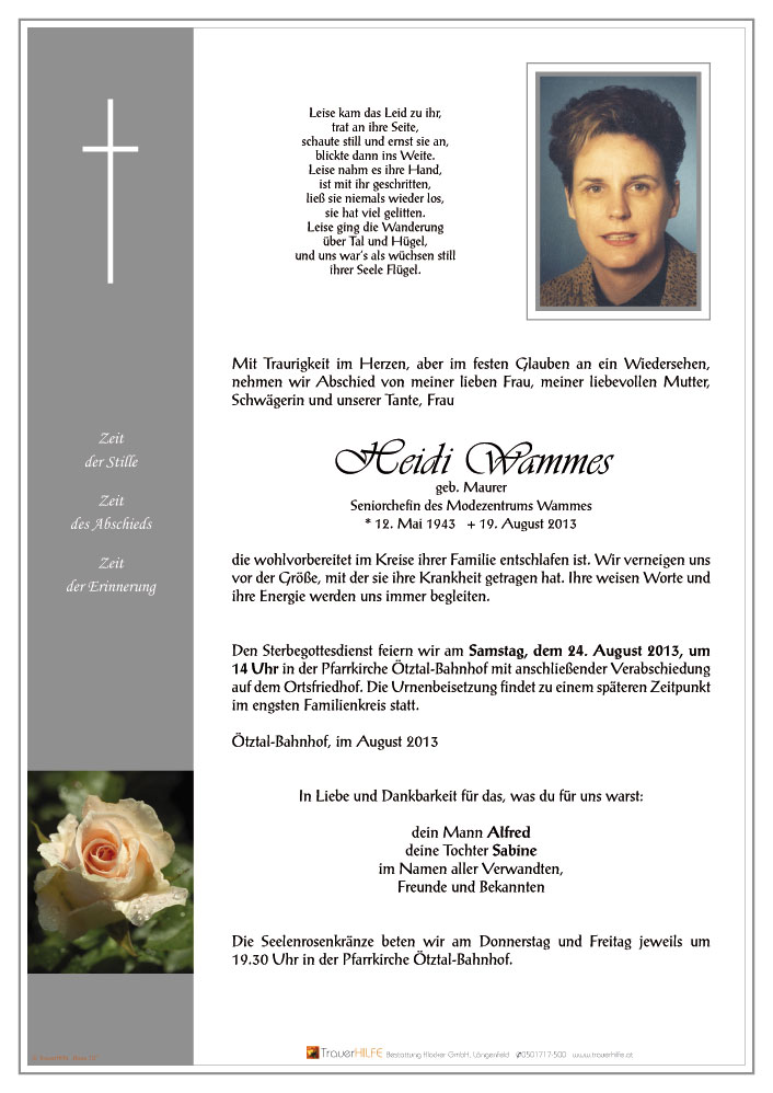 Ein großer Leidensweg hat sein Ende gefunden. Trost kann uns nur die Gewissheit geben, daß Heidi nun an einem Ort angekommen ist, an dem sie ohne Leid und Beschwernis zu uns herabschauen kann.