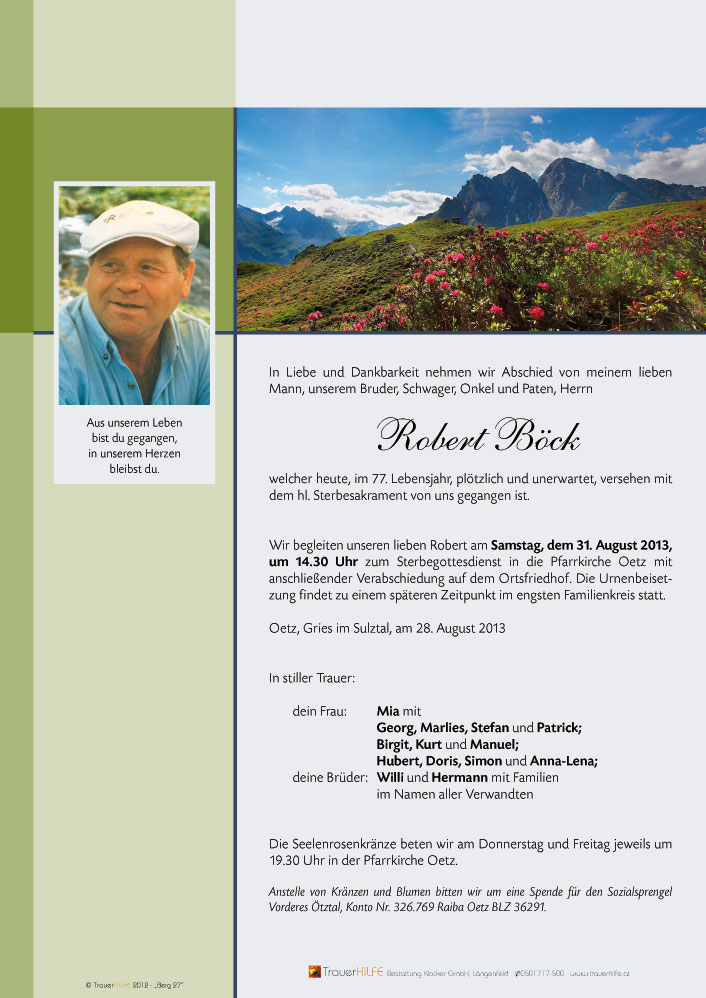 Möget Ihr schnell Trost finden, der es Euch erlaubt, Euch an die schöne verbrachte Zeit mit Robert zu erinnern. Das Leben ist zwar vergänglich, doch die Erinnerung an ihn bleibt Euch ewig erhalten.