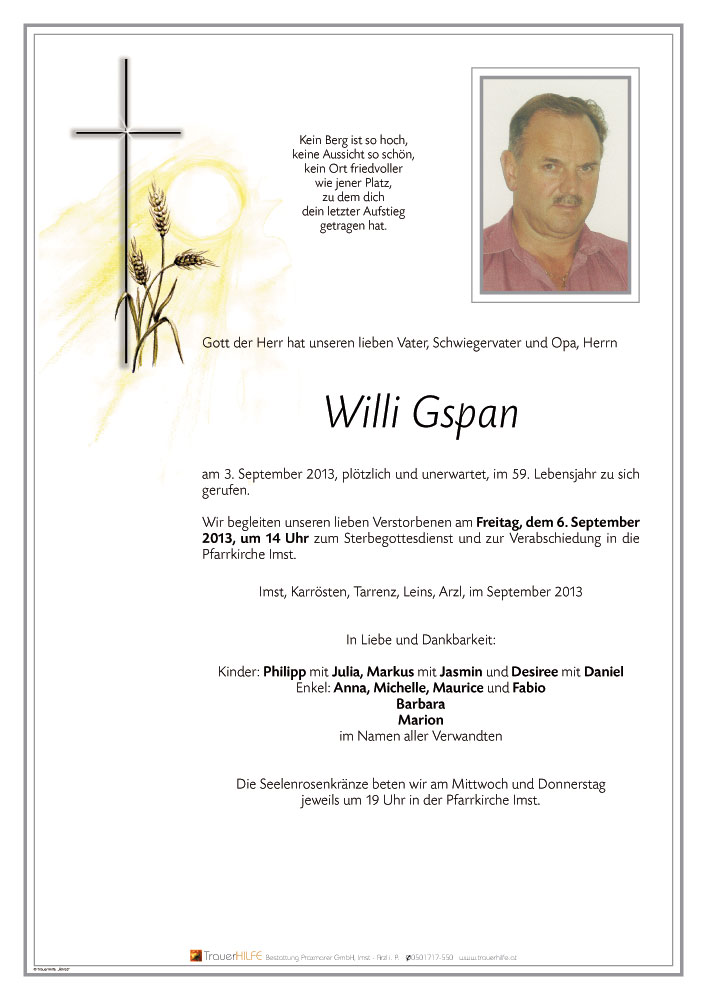 Am plötzlichen und allzu frühen Ableben eures lieben Willi möchten
