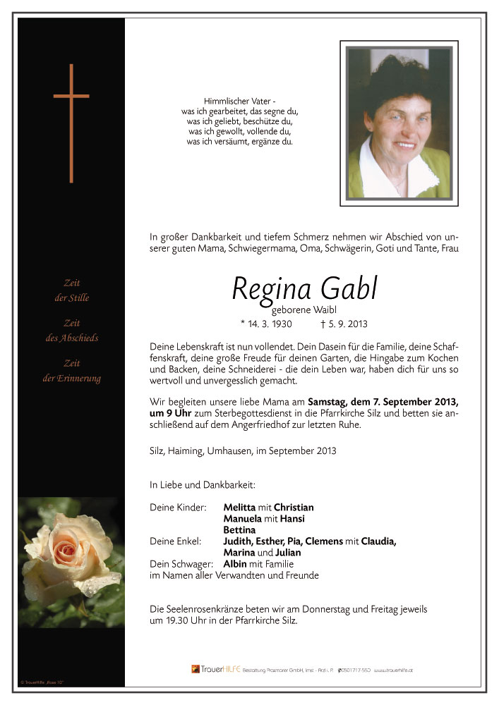 Liebe Manuela, geschätzte Trauerfamilie! Wir sind in den Stunden des Abschiednehmens von Eurer Mama bei Euch! Aufrichtige Anteilnahme,