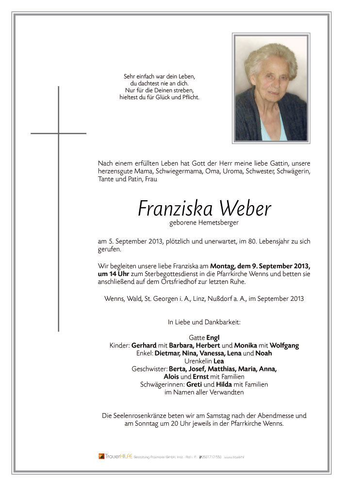 Unsere aufrichtige Anteilnahme, sowie viel Kraft und Zuversicht für die Zukunft.06.09.2013 14:53 - Bair Barbara, Bernhard & Irene mit Fam.