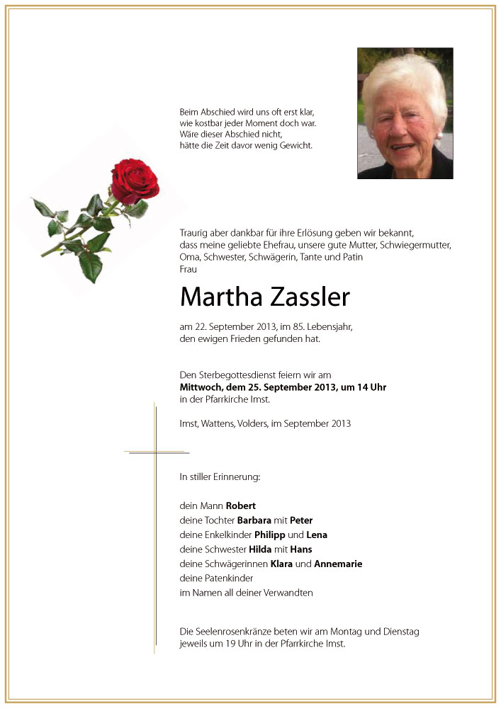 Am Ableben eurer lieben Martha möchten wir euch allen unser auf-