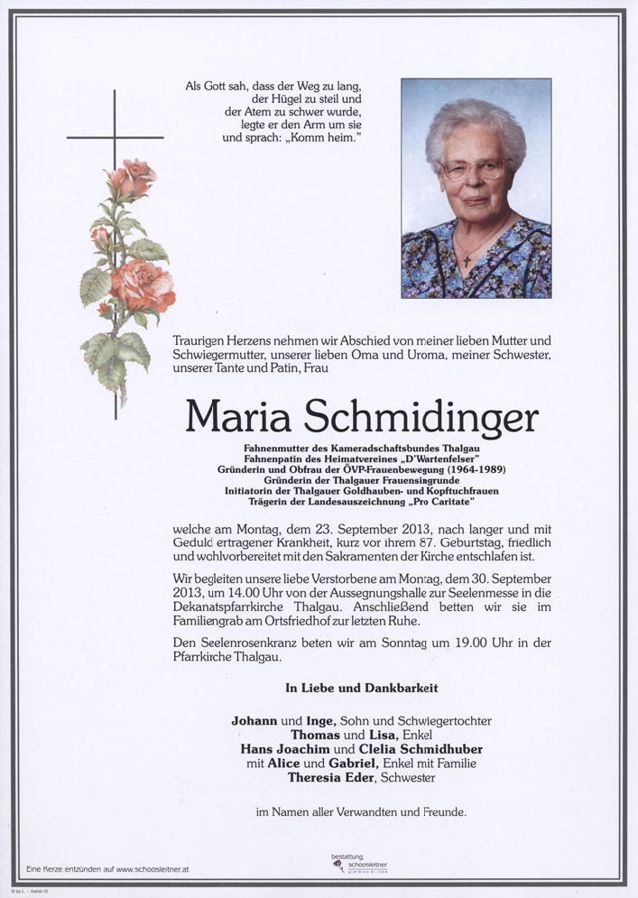 Neue Kerze für Maria Schmidinger entzünden.