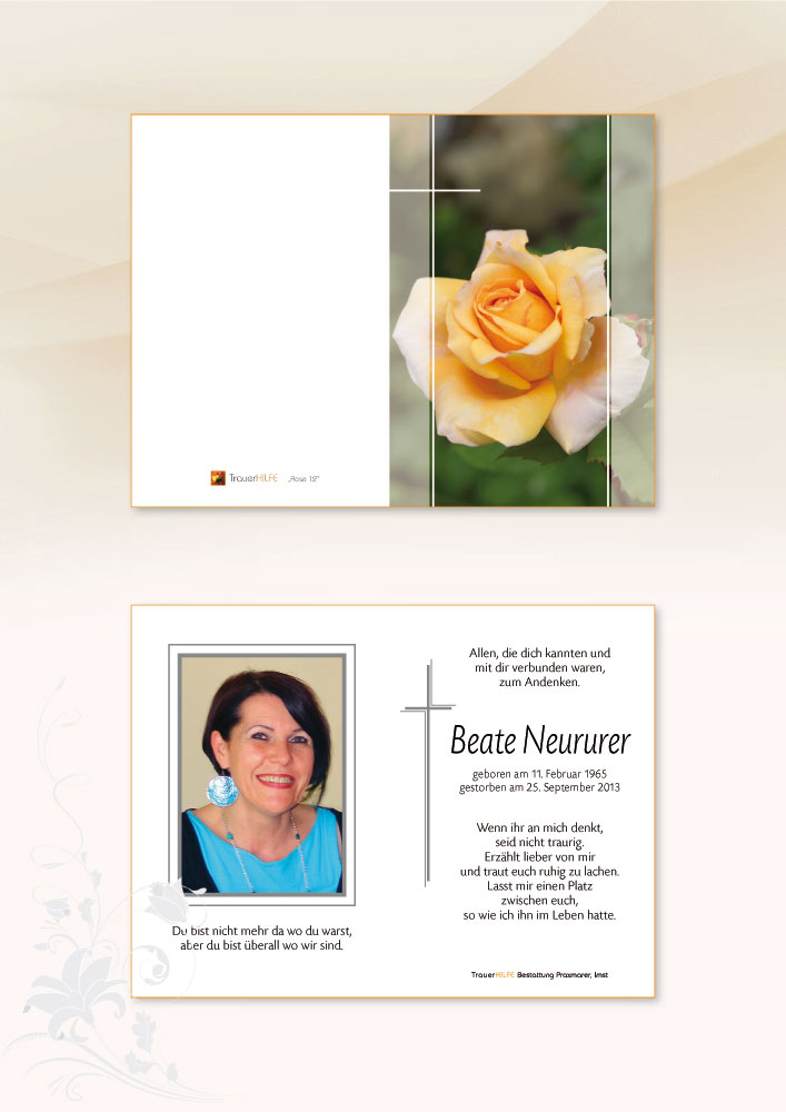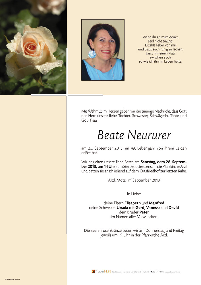 Vor knapp 13 Jahren (05.10.2000) mussten wir uns von unserer gleichnamigen, damals 17 - jährigen Tochter Beate unerwartet + plötzlich verabschieden.