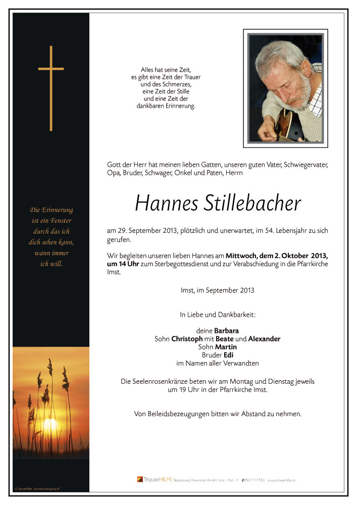 Hannes, lange ist es her, da saßen wir in einer Klasse des BRG Imst. Viel Zeit ist vergangen, da kreuzten sich unsere Wege wieder durch auch deine Liebe zur Musik. Mach drüben vieles besser, lass deiner Seele freien Lauf. Deinen Lieben, Barbara, Christoph, Martin, viel Kraft in dieser Zeit.