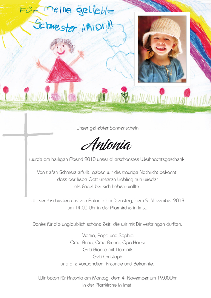 Am Heimgang eurer lieben Antonia möchten wir euch unser aufrichtiges Beileid aussprechen! Euer kleiner Engel wird euch alle vom Himmel aus beschützen! Möge euch der Herrgott viel Kraft schenken in dieser schweren