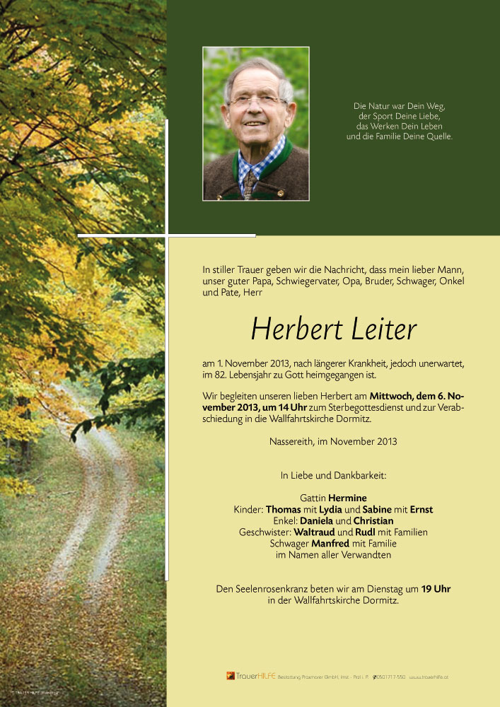 Ich hatte Gluck Das ich ein Mann wie Herbert Leiter kennengelernt habe. Hebert ist ein besonders wunderschone person! Herbert und ich war in kuhtai wo ich bei Ihm schifahren gelernt habe. Er hat mir gesagt eine Schi helm zu Kaufen und am nachsten tag beim schneeflug hat er auf meinem helm geschlagen und sagte nicht am hintern sitzen vorne vorne.... Helm war doch Wichtig gewesen!