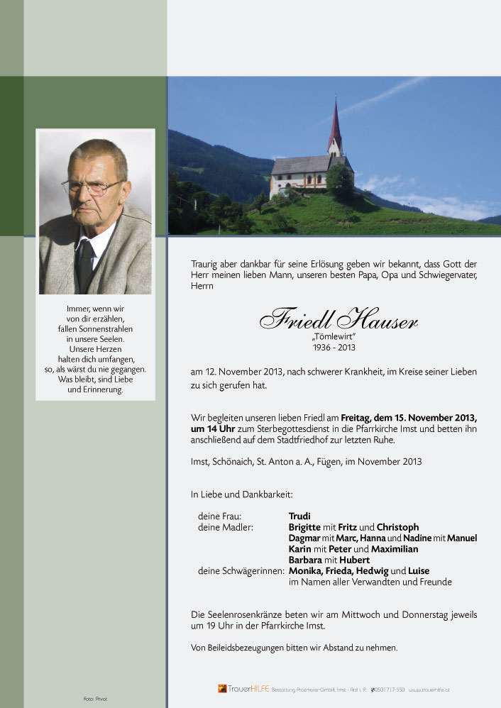 aufrichtige Anteilnahme am Heimgang eures lieben Friedl entbieten Marina und Peter14.11.2013 13:12 - Peter und Marina Schillfahrt