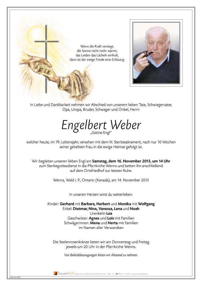 Am Ableben eures lieben Vaters, Opas und Uropas möchten wir euch allen unser aufrichtiges Beileid aussprechen! Möge euch der Herrgott