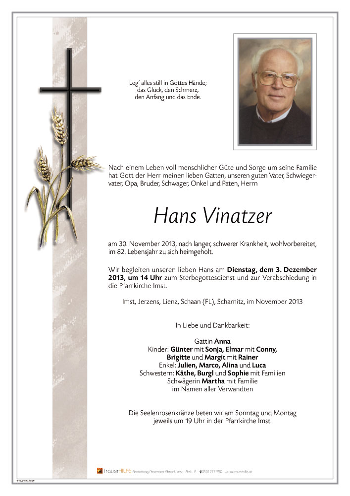 Geschätzte Trauerfamilie! Ich möchte Ihnen meine aufrichtige Anteilnahme ausdrücken. Hans bleibt mir als treuer Raika Ötztal-Bhf.-Bankkunde und echter Fußballfan in bester Erinnerung.