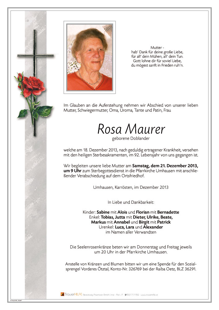 Aufrichtige Anteilnahme am Tode Eurer lieben Rosa entbieten