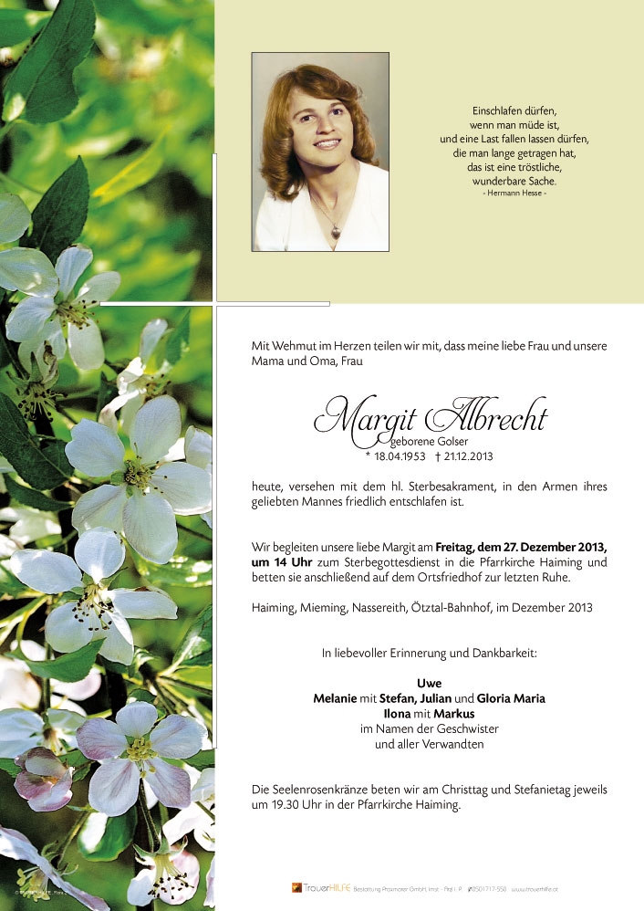 Liebe Melanie, Liebe Trauerfamilie! Ich moechte dir mein herzliches Beileid ausdruecken. Ich habe es leider auch schon mitgemacht wenn ein Elternteil von uns geht. Meine Eltern habe ich innerhalb von eineinhalb Jahren verloren. Es tut mir wirklich Leid fuer euch und man vermisst sie sehr. Liebe Melanie ich hoffe du kannst dich noch an mich erinnern. ( Kaufm. Berufsschule Imst) es wuerde mich sehr freuen wenn wir wieder einmal Kontakt haben koennten. Machs gut und alles Gute Julia aus Landeck