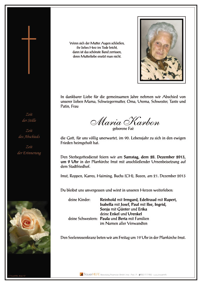 Am Heimgang eurer lieben Mama, Schwiegermama, Oma und Uroma möchten wir euch allen unser aufrichtiges Beileid aussprechen!