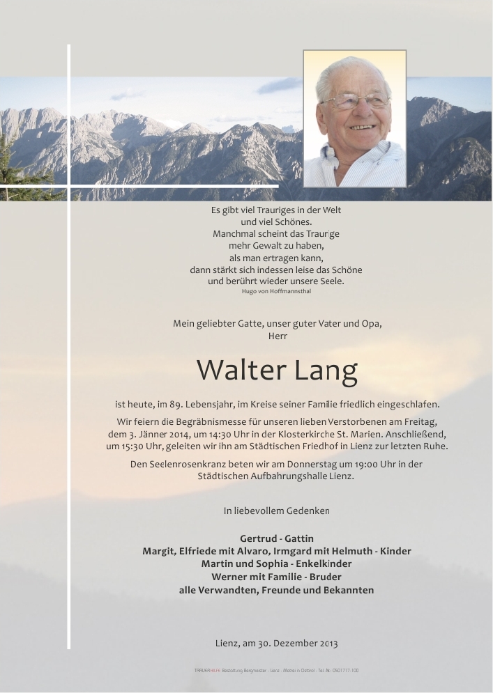 wir möchten Euch und Eurer Familie unser aufrichtiges Beileid ausdrücken. Wir haben die letzten Jahre indirekt Eure Familie ein wenig kennen lernen dürfen, so stark wie Ihr gemeinsam jetzt ward, gibt mir das Gefühl das Walter in Frieden gehen konnte. wir wünschen Euch viel Kraft und Ruhe für das gerade begonnene Jahr!05.01.2014 14:03 - Martha und Klaus Lindinger