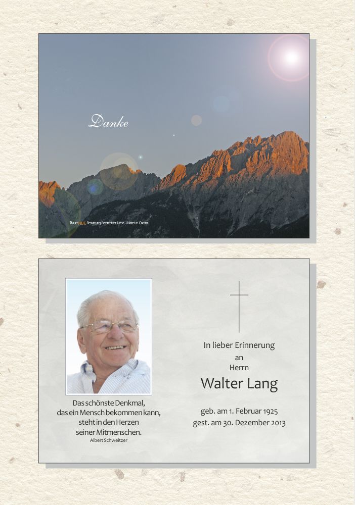 Dir, lieber Onkel Walter, danken wir auf diesem Weg für die schönen Zeiten und Erinnerungen, für die Stunden im Kreise der Familie, die gemeinsamen Bergtouren, für Deinen Humor und Deine Warmherzigkeit. Die Spuren von Liebe, die du in unseren Herzen hinterlassen hast, werden uns immer begleiten.