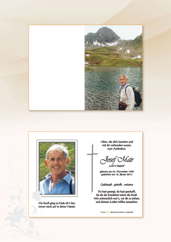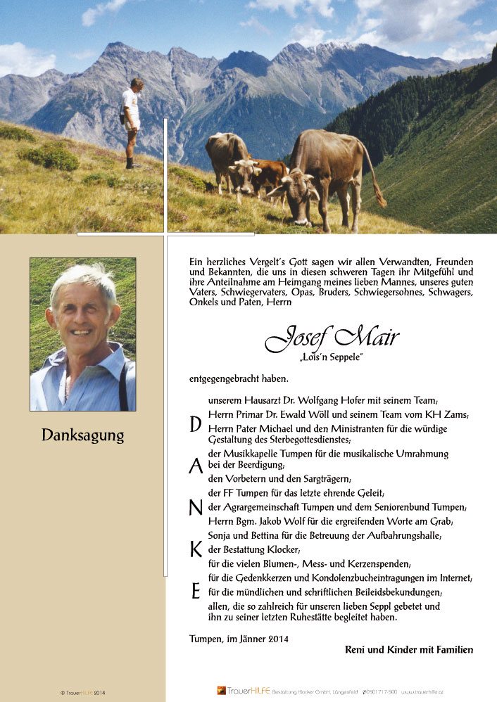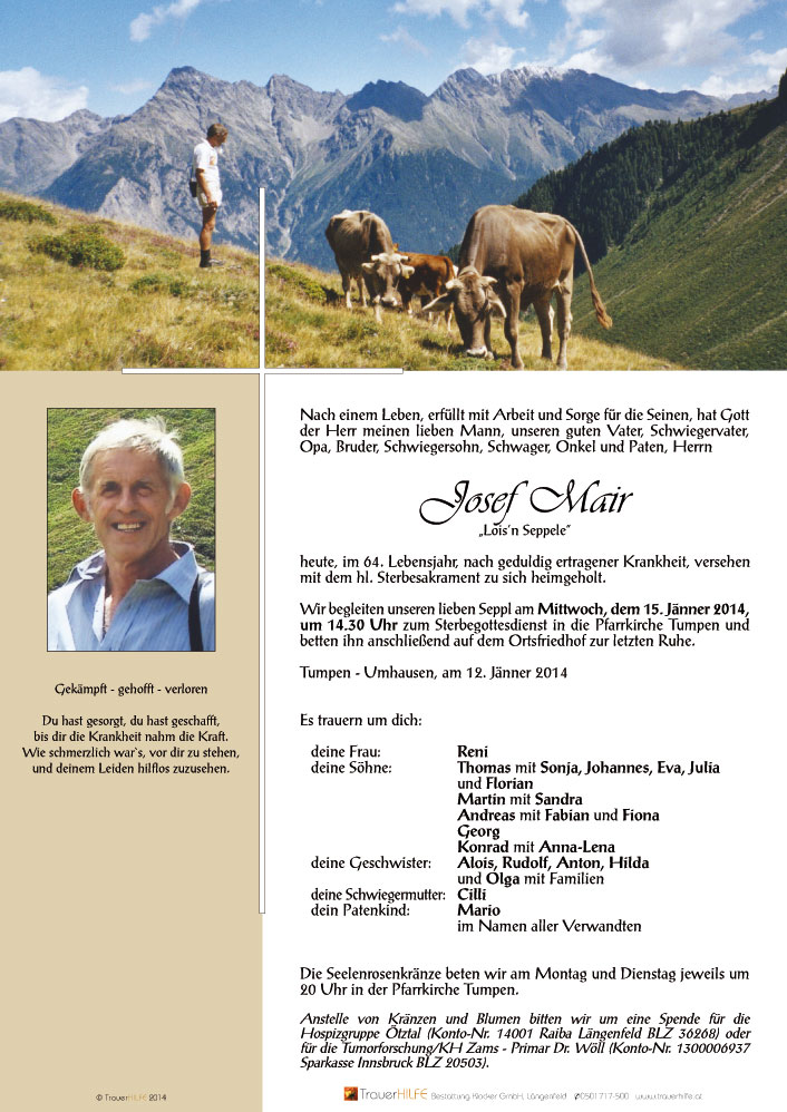 Dir lieber Goti und enk Buebn, wünsch ich von Herzen, dass euch die schönen und besonderen Begegnungen, sowie die Erinnerungen an die gemeinsam verbrachte Zeit und die wertvollen Momente mit´n Seppl, euern Papa und Mann, über diese schwere Zeit des Abschiednehmens hinweg helfen und euch genügend Kraft & Mut für die Zukunft geben!