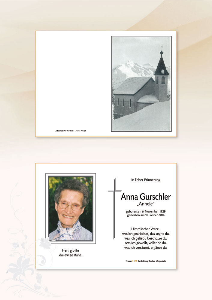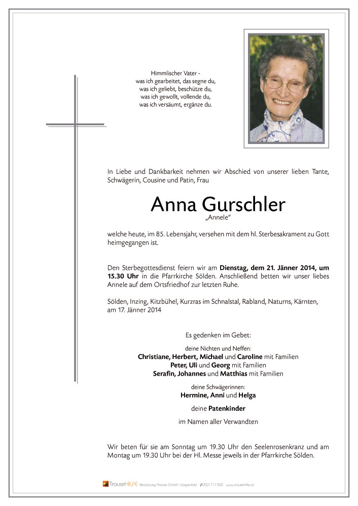 Mit "Annele" ist das letzte Mitglied dieser Generation der Familie Gurschler von uns gegangen. Nach einer kargen und schwierigen Kindheit und Jugendzeit folgten Jahrzehnte geprägt von gedeihlichem Schaffen im Sinne der Familie, von Bescheidenheit und Zufriedenheit. Es ist uns ein Anliegen, sie stets in bester Erinnerung zu behalten.