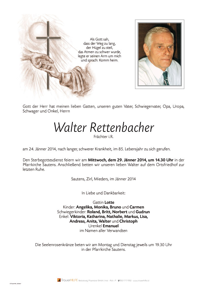 herzlichstes Beileid zum Tode von Walter. Er war ein ganz besonderer Mensch. Herr gib ihm die Ewige Ruhe.28.01.2014 08:10 - Markus Kneisl