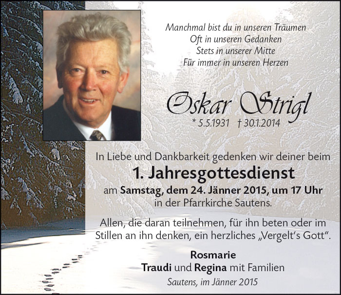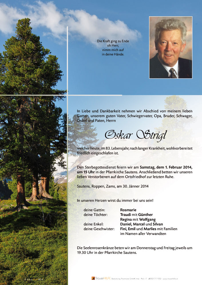 Zum Ableben von Oskar sind wir in Gedanken bei Euch und wünschen viel Kraft in diesen schweren Stunden.31.01.2014 11:26 - Hermann und Marietta mit Kinder