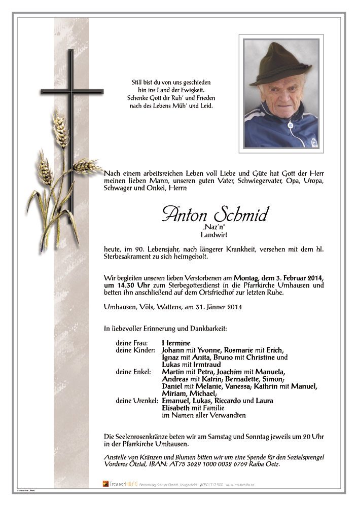 Aufrichtige Anteilnahme am Tode Eures lieben Toni entbieten