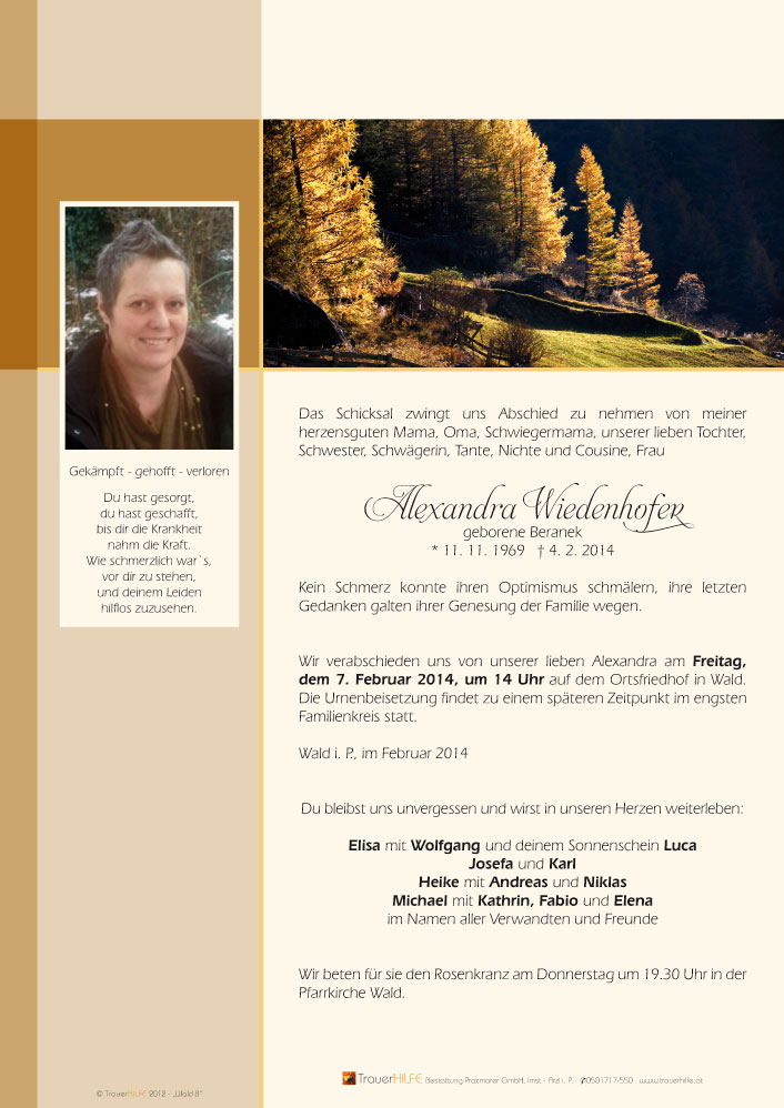 Aus unserer Jugendzeit ist mit Alexandra noch in guter Erinnerung! Sie war ein fröhlicher und lieber Mensch. Ich fühle mit euch und es tut mir unheimlich leid, dass ihr nun diesen schweren Weg gehen müsst. Aber ihr werdet euch wechselseitig stützen und euch Kraft geben um wieder neuen Mut zu fassen.
