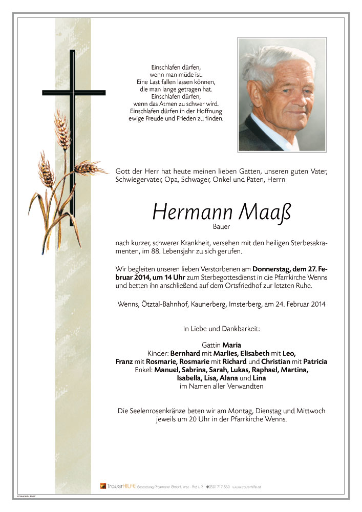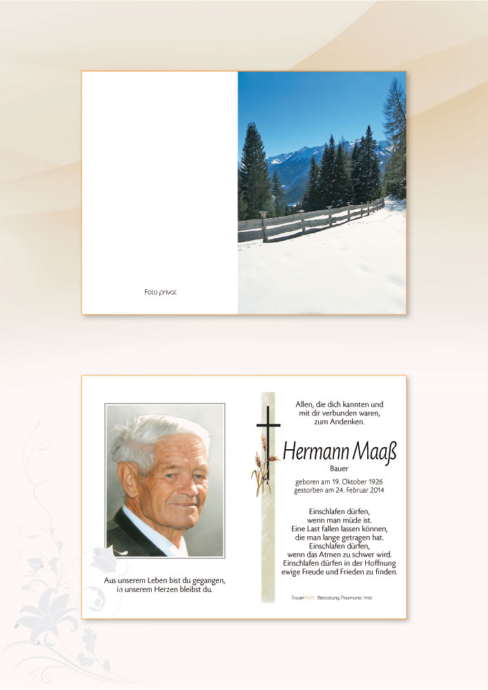 Euer Vater war Bergbauer mit Leib und Seele. Wir konnten ihn oft auf seinem Hof und seinen Feldern bei der Arbeit antreffen. Hermann war auch ein sehr gläubiger Mensch, dem die sonntägliche hl. Messe sehr viel bedeutete.