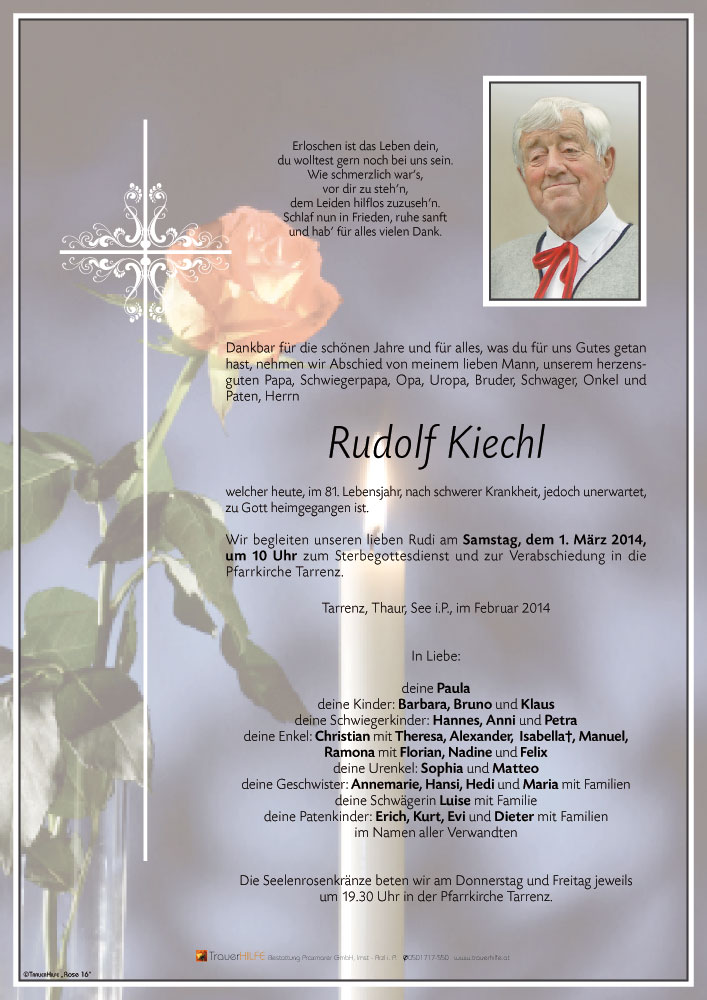 Mit rudl hab ich viele schõne stunden im rahmen der blasmusik verbracht. Rudl war stets ein vorbild fûr mich und persõnlichkeiten seiner art wird es kaum mehr geben! Viel kraft meinerseits und meiner familie ..........