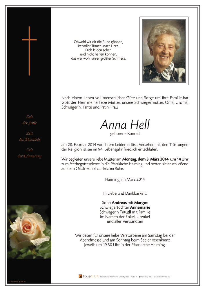Ein langes erfülltes Leben wurde eurer Oma geschenkt. Sie wird uns abgehen, kein nettes Grüßen und Lächeln mehr regelmäßig vor unserem.Haus.
