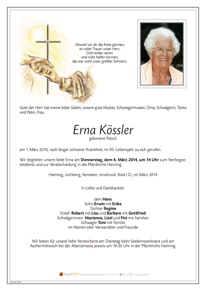 Lieber Hans, liebe Regina mit Trauerfamilie! In den schweren Stunden des Abschiednehmens möchten wir Euch unser ehrliches Mitgefühl ausdrücken. Erna war eine besondere Persönlichkeit, die in allen Lebenssituationen Außergewöhnliches geleistet hat. Sie war auch eine ausgezeichnete Köchin und aufmerksame Gastgeberin und hatte ein offenes Ohr, was das kulturelle Leben in Haiming betraf.
