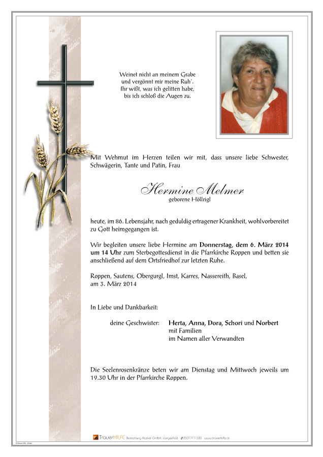 Aufrichtige Anteilnahme am Tode eurer Lieben Hermine, entbieten Firma Steintec, Steinmetzbetrieb Umhausen.