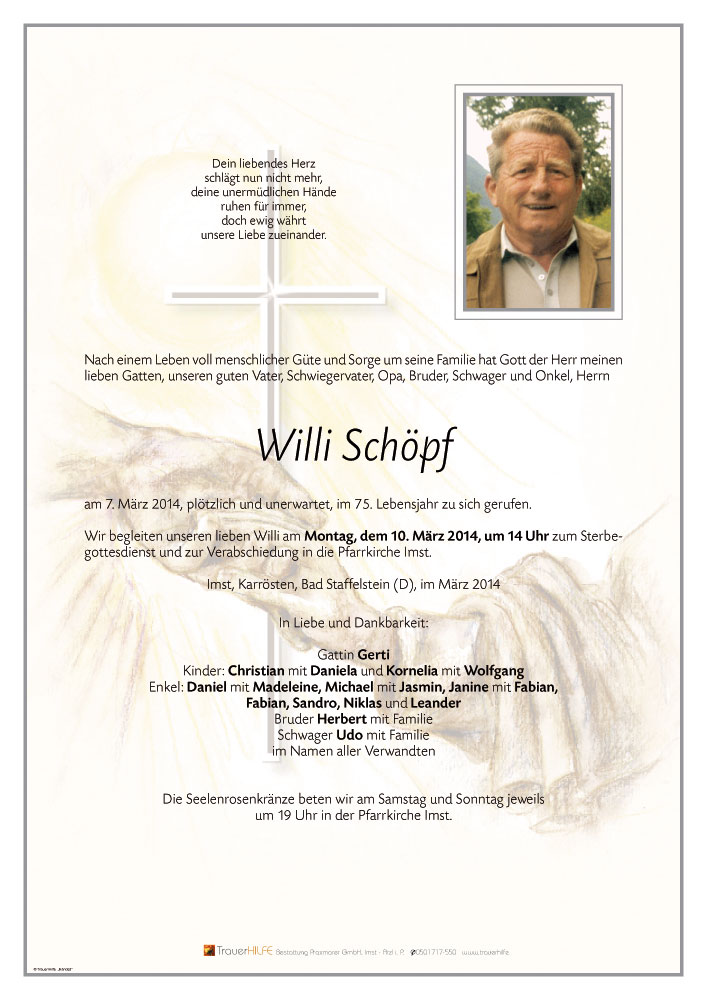 Es ist schwer für uns, euch die richtigen Worte zum Trost zu sagen.Tief bestürzt haben wir vom Tod von Willi erfahren.Ihr verliert euer Liebstes.Das Leid können wir nicht aus der Welt schaffen,auch wenn wir Euch dies in einer solchen Situation wünschen würden.Wir wünschen Euch in diesen schweren Stunden die Kraft,den Verlust zu überwinden.Es ist uns klar,dass euch im Moment eigentlich nichts trösten kann.Unsere ganze Anteilnahme und Mitgefühl mögen Euch trotzdem das Gefühl geben,dass ihr in dieser schweren Zeit nicht alleine seid.Unsere Gedanken sind bei Euch