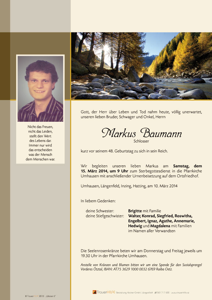 Aufrichtige Anteilnahme am Tode eures Lieben Markus, entbieten Firma Steintec, Steinmetzbetrieb Umhausen.