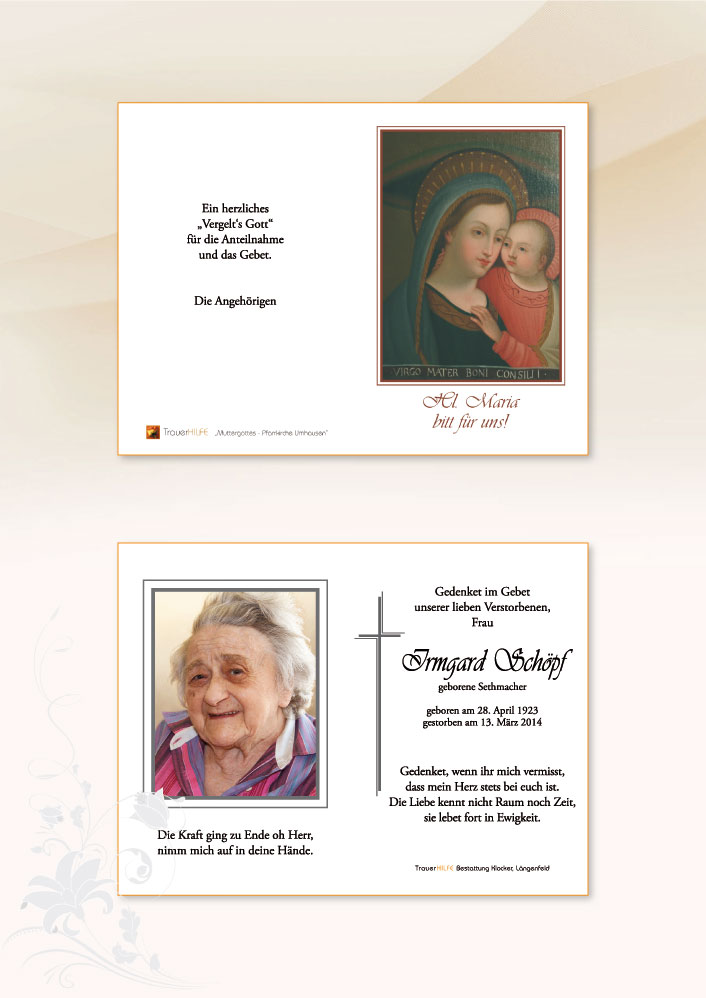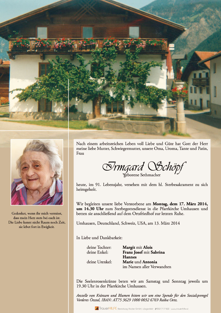 Eure liebe Irmgard wurde heute von ihren irdischen Leiden erlöst und somit von ihrem Schwindel oder "Tirml", wie sie ihn immer bezeichnet hat, und ihren Schmerzen befreit.