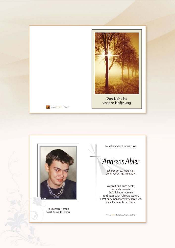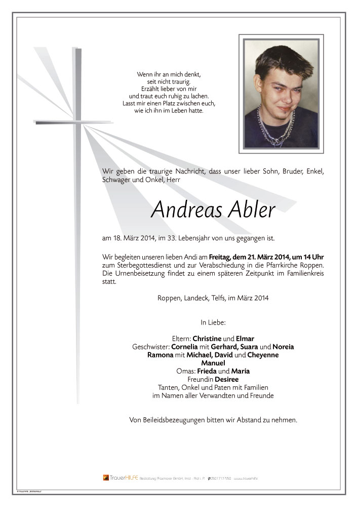 Ich habe Andi immer als sehr netten und hilfsbereiten Menschen erlebt, die Nachricht vom Heimgang eures lieben Sohnes hat auch mich sehr traurig gemacht. Aufrichtige Anteilnahme entbietet Tanja20.03.2014 12:34 - Tanja (eine ehemalige Mitschülerin)