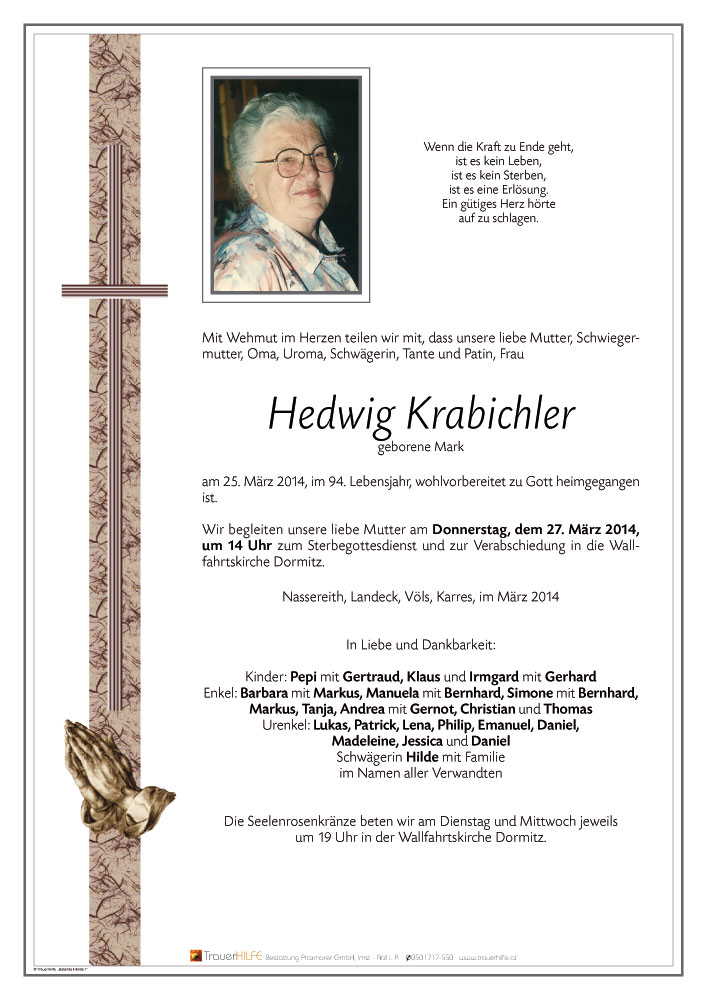 Neue Kerze für Hedwig Krabichler entzünden.
