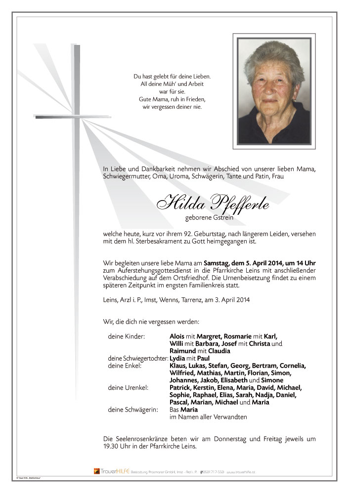 Zum Tod eurer Oma entbieten wir unser herzlichstes Beileid!04.04.2014 09:40 - Nadja und Andi Strele