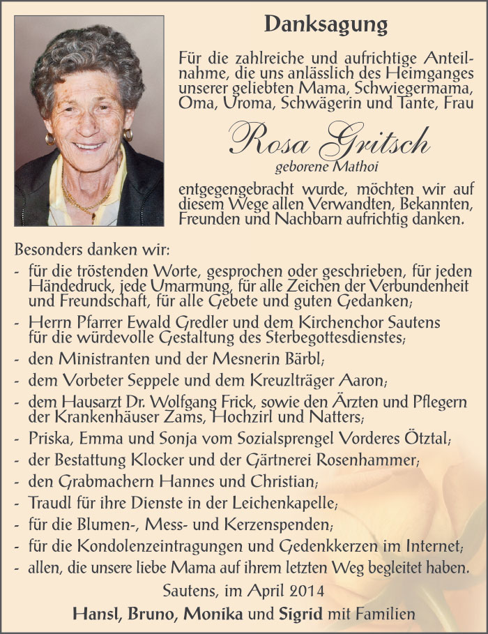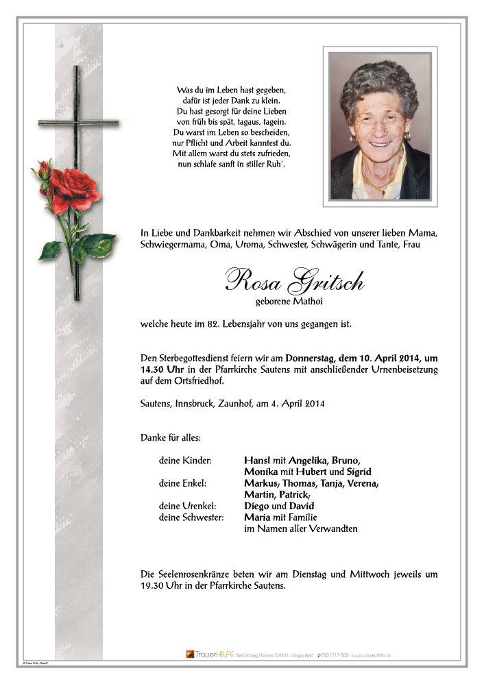 Herzlichste Anteilnahme den Angehörigen der Familie Grutsch entbietet Euch von ganzem Herzen Rosa und Pepi Huter mit Familie.09.04.2014 11:59 - Rosa und Josef HUTER, Leins